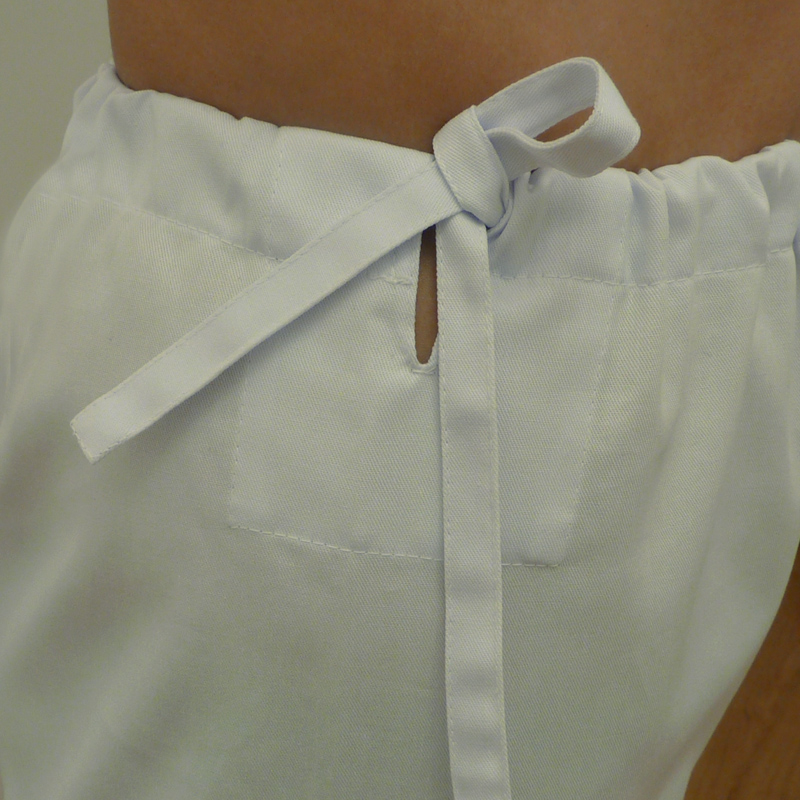 Bequemer Schnitt mit variablem Bund: Gummi mit einem Band am Ende zur Weiteneinstellung. Hose mit Keil im Schritt und Verstärkung im Knie.